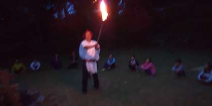 火の神様に火を分けてもらい、点火です。炎は3メートルくらい燃え上がりました。さあ、キャンプのメンイベントの開始です。