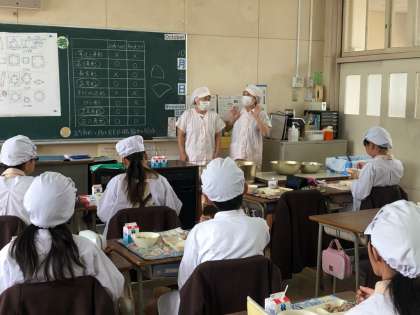 いつもおいしい給食を作ってくださっている給食調理員さん。いつもは給食室で忙しくしていますが、今日は6年1組の教室に給食時間の様子を見に来られました。