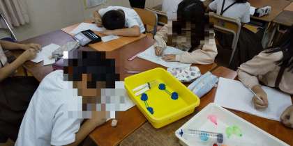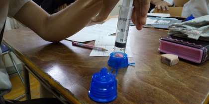 4年生は、理科で『空気や水の性質」を学習しています。注射器を使って、空気や水を圧縮めて、閉じ込められた空気は圧し縮められ、元に戻ろうとする。空気の体積がいいさくなると圧し返す力が大きくなることを学んでいます。
