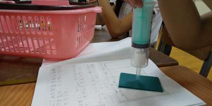そして、注射器を圧すとそれらは小さくなっているのを見て、空気は圧し縮めることができ、元に戻ろうとして大きな力を持つということを学習していきました。生活の中では、その力を使って、『タイヤ』『エアピストル』『エアダンパー』『ドッジボール』などに使われていることを調べていきます。また水でも同じように調べ、空気と水の性質の違いを明らかにしていきます。