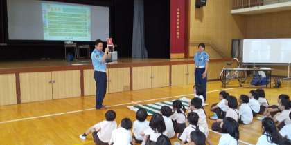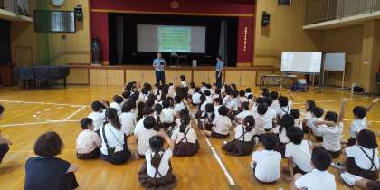 曽根崎警察署の交通課の方に来ていただいて、交通安全指導を行いました。雨が降るという予報でしたので、当初予定していた『自転車の乗り方』の交通安全指導ではなく、講堂で「安全な歩行の仕方」について学習しました。