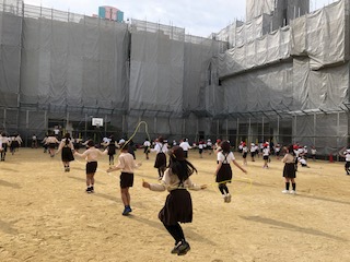今日から29日まで2週間のなわとび週間が始まりました。運動委員会の児童のリードでポップコーンの曲に合わせて、いろいろな跳び方を練習します。毎年この時期になわとび週間を実施しているせいか、高学年の児童はいろいろな技を連続して軽快に跳ぶことができます。低学年の子どもたちにとって、とてもいいお手本です!