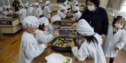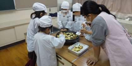 11月のはじめごろに収穫したサツマイモを使って、2年生は1組と2組合同で、生活科でお芋の調理をしました。初めて家庭科室に行き、給食のエプロンを着て、サツマイモをきれいに洗った後、ピーラーでお芋の皮をむき、お芋を薄く切って、ホットプレートでこんがりと焼きました。10分くらいするとお芋がきつね色に焼きはじめ家庭科室はお芋が焼けるにおいでいっぱいでした。あまり焼きすぎないように、フライ返しでひっくり返し、じっくりと焼いていきました。焼けたお芋は大変ほくほくして、おいしかったそうです。職員室にもおすそ分けをしてくれました。