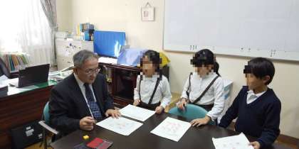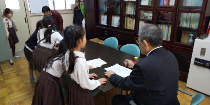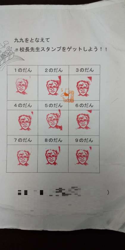 担任がそれぞれ、「上がり九九、下がり九九、バラバラ九九」をチェックした後、仕上げに校長室で九九の検定をしています。15分休みとお昼休みにやっていますが、校長先生もなかなか所用で毎日とはいきませんが、検定会場の校長室が開いているときはたくさんの2年生が校長室を音連れて九九を言います。合格したら校長先生の似顔絵スタンプがもらえます。全員合格を目指して頑張りましょう。