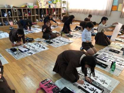 1月9日(木)、今日の給食はお正月の行事献立でした。おせち料理(ごまめ)とお雑煮を食べました。これは、新年に日本の伝統文化を感じるもののひとつでしたが、6年生はもうひとつ、書初めをしました。今回は机に向かってではなく、床で書く方法で書きました。普段と違った雰囲気の中、半紙も書初め用のもので集中して書いていました。