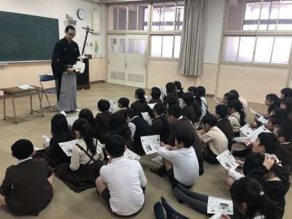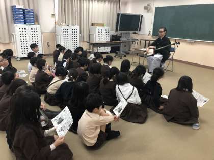 1月21日(火)5時間目 木ノ原さんのお父さん 鶴澤友之助さんに来ていただき,大阪で始まった伝統芸能文楽についてお話を聞かせていただきました。文楽は人形浄瑠璃のことで,浄瑠璃という音楽に合わせて人形をあやつり演じる人形芝居のことです。今回は文楽で使われている太ざお三味線で,実際に舞台で弾かれている曲や,曲の中に入っている動物の鳴き声をあてるクイズなどをしていただきました。デーン,デーンとお腹に響く迫力ある音で,子どもたちからも歓声があがりました。