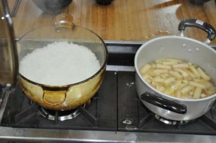 今日は、5年生が家庭科の時間に調理実習をしました。ご飯を炊いて、お味噌汁を作りました。