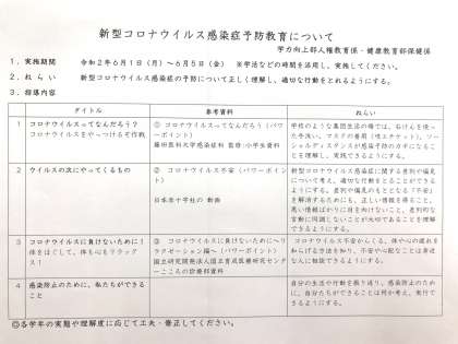 各学級の学活の時間などに「新型コロナウイルス感染症予防教育」を実施しました。病気や予防について正しく理解し、適切な行動がとれるようにするため、指導計画を立てて、各学年の発達段階に合わせて指導しました。指導のまとめとして、大切な命を守るために自分たちにできることについて考えました。