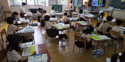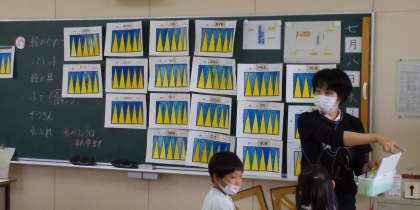 2年生は水彩絵の具を使って初めての絵をかきました。パレットの使い方、水の使い方や交換の仕方、塗分けの方法と基礎的ながらの学習です。まだまだ指導内容は多く、濃淡の付け方や混色の仕方、てんぬり・メンぬり様々です。でもみんな楽しそうに学習していました。