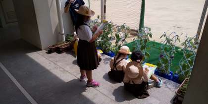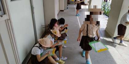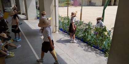 い年生は今日探検ボードをもって、朝顔の観察をしました。水色、紫、赤、紺色など様々な色の朝顔が観察できました。個人懇談会で、保護者の方にお家に持って帰ってもらいます。夏休み種になるまでの観察が宿題になると思います。よろしくお願いします。