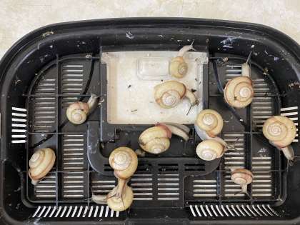 ふたいっぱいについているカタツムリをみて、「ギャー」と叫び声!