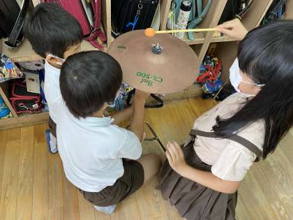 じっと耳をすましてみると,いろいろな音が聞こえてきます。音はどうやって出たり,伝わったりしているのでしょうか。今日は楽器を使って,音が大きいときと小さいときでは,もののふるえ方は違うのかを、4つの楽器(トライアングル・シンバル・小太鼓・ウクレレ)を使って調べました。
