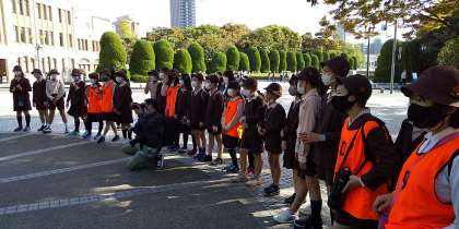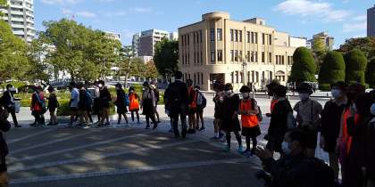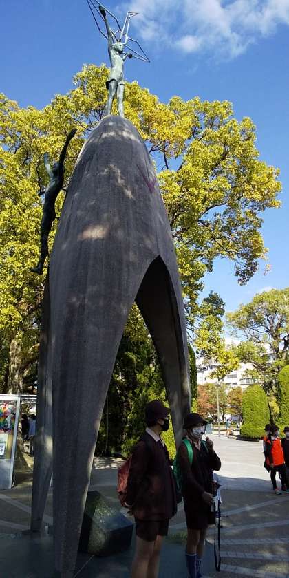 原爆の子の像の前で、持ってきた千羽鶴を捧げました。平和って大事だね。