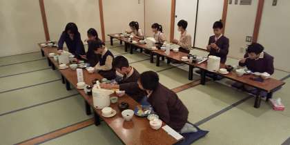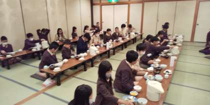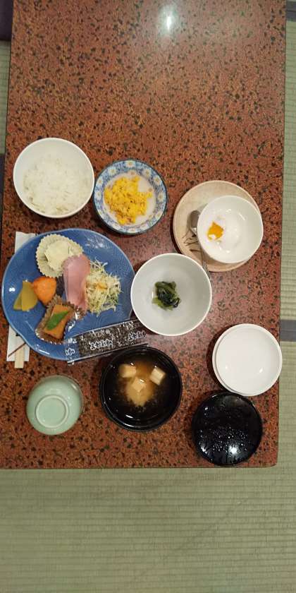 今から、朝ごはんです。検温しましたが、全員平熱でした。今日は宮島まで行きます。8時の広島電鉄です。