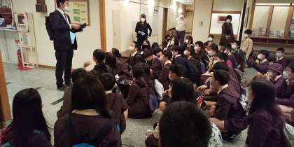閉舎式をして、八丁堀駅から広島電鉄に乗ります。宮島口駅まで一時間かかります。預かっていた財布も配り、2000円のクーポンも配りました。厳島神社の鳥居が工事中なのが残念です。