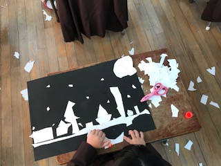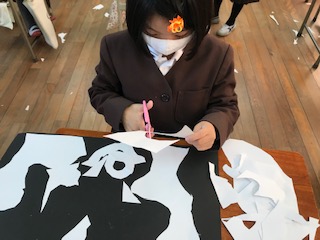 白い紙をはさみでどんどん切ることを楽しみながら表したいことを見つけ、置き方や並べ方を工夫しました。「どんどん切っていくのは楽しいな」「おもしろい形ができたよ」など、子どもたちはいろいろな思いをつぶやいていました。黒い画用紙の上に置いてみると、形がはっきり見えてきます。並べていくとおもしろいことを思いついたようで、にこにこしながら楽しそうに制作してました。