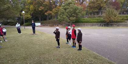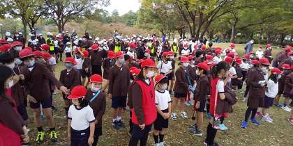 オリエンテーリングが終わり、閉会式をしています。予定より20分位早いです。児童の代表が司会や得点発表をしています。
