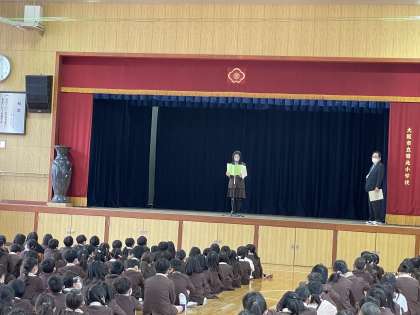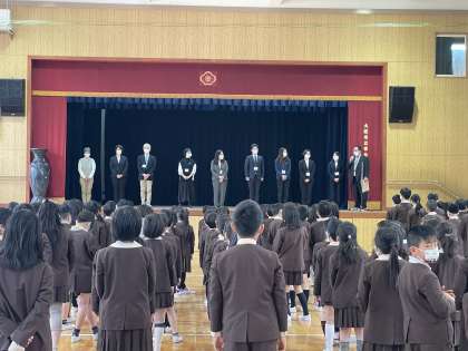 登校してきた新2年生以上の児童が講堂に集まり、新しく着任した教職員を紹介する着任式を最初に行いました。着任した教職員一人一人からのあいさつや、児童代表からの歓迎の言葉がありました。