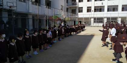 全校朝会で、本年度入学してきた1年生43名が朝会デビューしました。