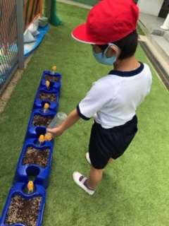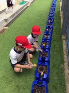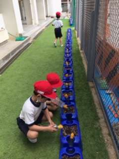 次の日から、毎朝登校したら水やりをしています。「たくさんさいてね」「おおきくそだってね」など、子どもたちをあさがおが咲く日を楽しみにしているようです。