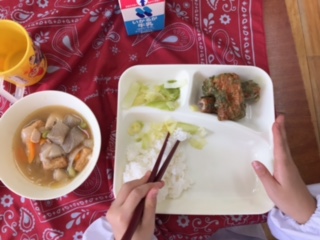 給食を取りに行った時には「いつもありがとうございます」「たくさんたべるよ」と笑顔で話している姿が見られます。