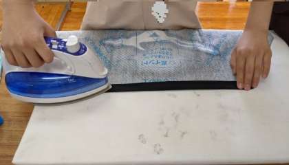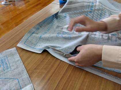 今回は、裁ちばさみで型を切り取り、ミシンで縫うところまで布を織り、アイロンをかけました。
