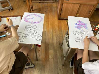 図工であじさいの絵を描きました。花の部分はちぎり絵で、あじさい色に染めた和紙をちぎって花の形に貼っていきました。