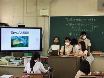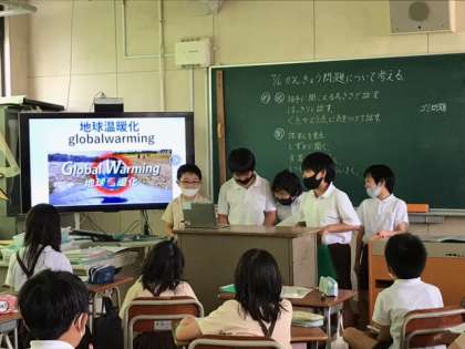 総合では、自分たちの身の回りにある環境問題に着目し、調べたいテーマごとにグループを作りました。子どもたちは一人一台端末を使って、インターネットで調べていました。グループで調べたことを共有し、「シンプルプレゼン」というアプリを使ってまとめました。写真やグラフを入れて、調べたことがより伝わりやすいように工夫していました。