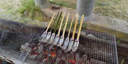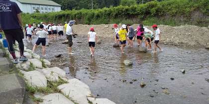 魚つかみ風景です。たくさん捕まえたチャンピオンは八匹です。
