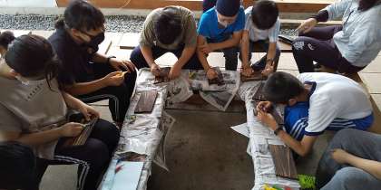 宿舎に戻り、昨日磨いた焼き板の色付けをしています。涼しいバーベキューテラスで、林間のお土産作りです。