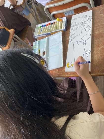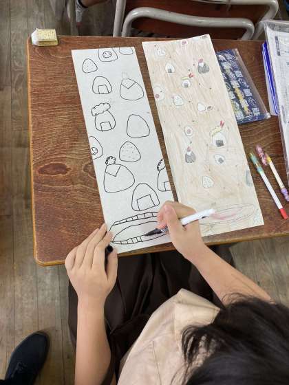 まずはデザインから描き始めました。それぞれテーマを決めて板に絵を描いています。