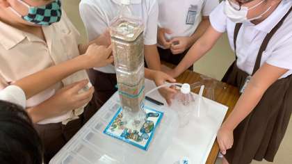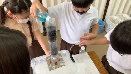 実験では、淀川の水がろ過装置でどこまで透明になるかを試しました。水の色は最初に比べてとてもきれいになっており、子どもたちも驚きを隠せない様子でした。