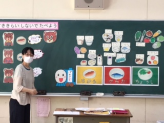 子どもたちは、毎日おいしい給食を食べています。今日は「すききらいしないでたべよう」について、栄養士の先生からお話を聞きました。