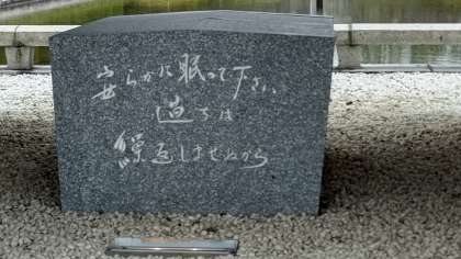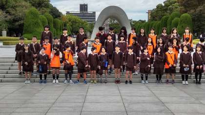 慰霊碑前で記念写真を撮りました。被爆体験の話を聞く時間まで、グループ行動になります。