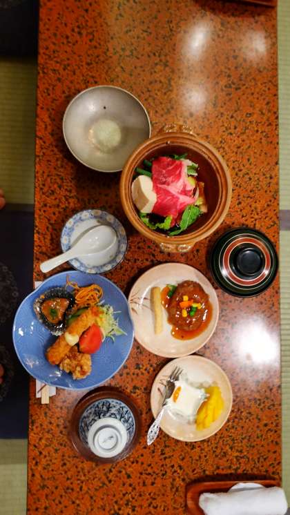 少し早い夕飯です。唐揚げ、海老フライ、ハンバーグ、煮物、すき焼き、子どもが好きなメニューです。