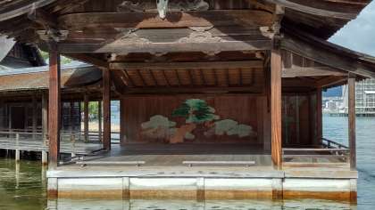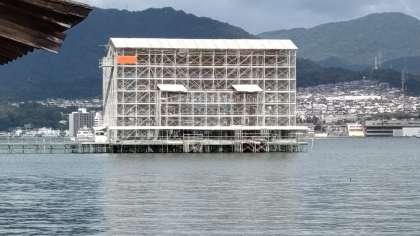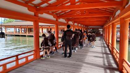 厳島神社を参拝して、集合写真を撮っています。大鳥居はやっぱり工事中でした。