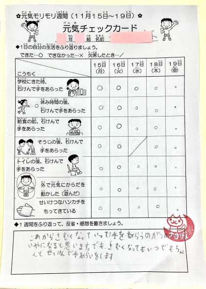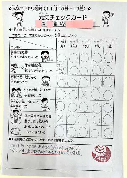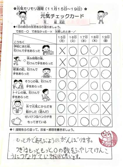 元気モリモリ週間が終わりました。毎日、元気チェックカードで手洗いや外遊びなどの自分の生活の振り返りをしました。全体的に手洗いの習慣は身について来ています。
