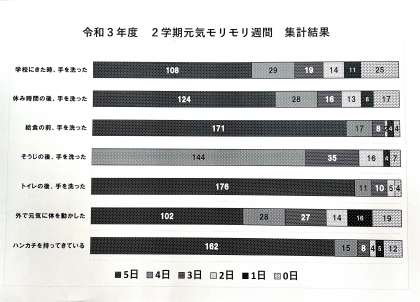 2学期の元気モリモリ週間の集計結果が出ました。全体的には手洗いの習慣は身について来ていますが、場面で見てみると「学校に来た時」に毎日手洗いができている児童は52.4%しかおらず、習慣化できている児童はまだまだ少ない状況でした。また、「外で元気に遊んだ」の項目では、毎日外で遊べている児童は49.5%で、寒くなるにつれて外で遊ぶ児童も少なくなっている状況です。コロナやインフルエンザなどの感染症にかからないためにも、毎日の手洗いの習慣を身に付け、外遊びなどで体を動かし、丈夫でたくましい体を作ってほしいと思います。