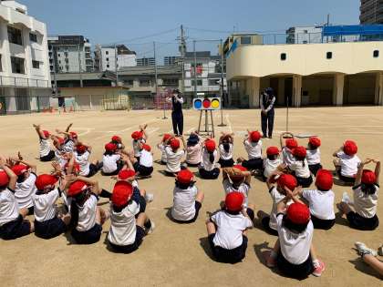 犯罪防止教室では、ビデオを通して外へ遊びに行くときの5つの約束を確認しました。また、もしも知らない人に連れていかれそうになったときのために、みんなで「たすけて!」と大きな声を出す練習も行いました。