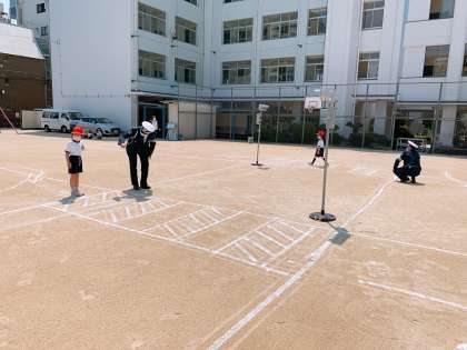 交通安全指導では、お巡りさんからのクイズにチャレンジし、標識や正しい信号の見方などについて教えてもらいました。また、運動場に横断歩道や信号を用意してもらい、教えてもらった歩き方で実際に歩きました。子どもたちも、横断歩道の前で「右・左・右」と一生懸命確認しながら歩いていました。