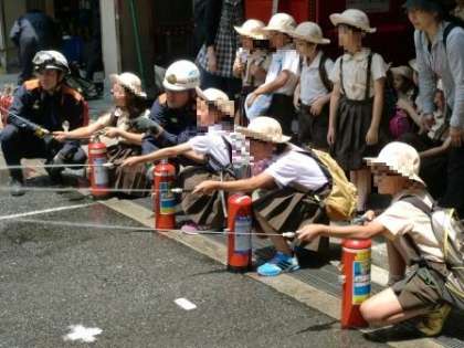 北消防署では、消防署に関するDVDを初めに見せていただき、その後、実際に消防車の見学や水消火器を使っての消火体験などもさせていただきました。署員の皆さんが実際に訓練をしている様子も見せていただき、子どもたちは、学びを深めることができました。