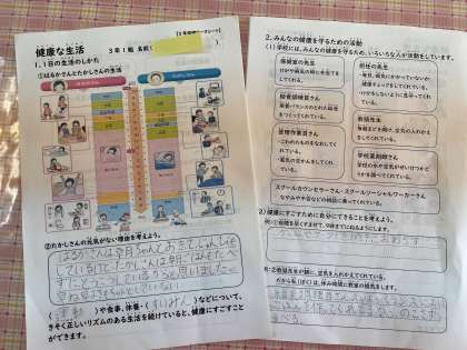 3年生で養護教諭による「保健」の公開授業を実施しました。健康の保持増進のためには、運動や食事、休養・すいみんなどについて、規則正しいリズムのある生活を続けることが大切であることを学習し、最後に健康に過ごすために自分にできることをワークシートに書きました。