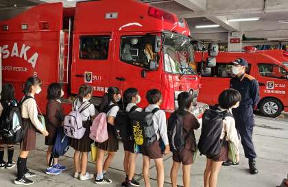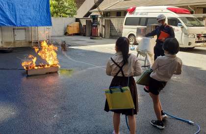 3年生は、社会科「安全なくらしを守る」の学習のため、北消防署へ社会見学に行きました。自分たちの生活を守ってくれている消防署の仕事について学習しました。練習用の消火器を使って消火体験をしたり、いろいろな種類の消防車の役割や機能を説明してもらったりして、子どもたちは目を輝かせて学んでいました。質問コーナーでは、「消防車には何リットルの水が入っているんですか?」、「出動するのにどれくらい時間がかかるんですか?」など、たくさんの質問に答えていただき、とても有意義で深い学びができた社会見学になりました。