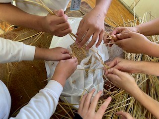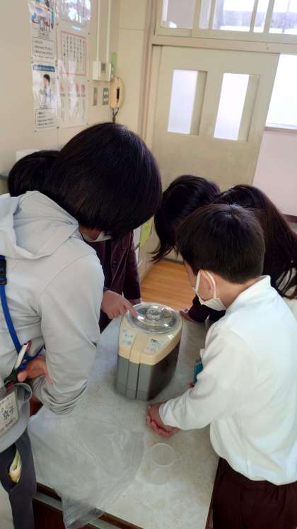 11月に地域のお米屋さんから稲穂ををいただきました。せっかくいただいたお米なので、みんなで脱穀し、籾摺り、精米をおこない家庭科の学習で鍋を使って炊いて食べました。白米の状態でしか普段見ることがないため、「手作業で脱穀するのは大変。」「精米してでてきた粉が糠なんだ!」と、子どもたちはたくさんの経験と発見をすることができました。