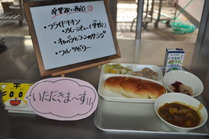 今日の給食は「卒業祝い献立」でした。6年生の小学校での給食も今日を含めてあと8日になりました。「卒業祝い献立」として、児童に人気の「鶏肉のからあげ」と「カレーライス」のアレンジしたメニュー