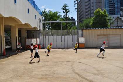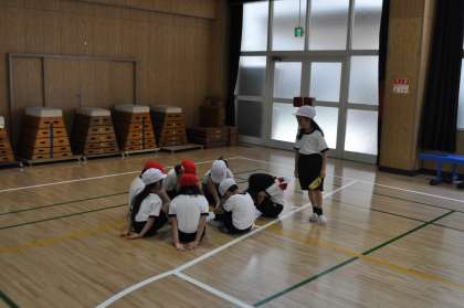 運動場で遊ぶグループは、大なわとびや鬼ごっこしました。講堂で遊ぶグループは、ハンカチ落としやじゃんけんゲームをしました。遊びが終わる頃には、すっかり仲良くなって、どちらの学年からも「もっと遊びたかったな」という声がたくさん聞こえてきました。