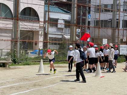 いつもは、他の小学校をお借りして50m走を実施していましたが、今年度は、エレベーター工事のために、運動場ではまったく対応できずに2種目をたのグランドを借りて実施しました。与力町グランドに行って、実施しました。