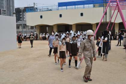 地域防災部、区役所、警察、そして保護者の見守られながら、学校を出て、広域避難場所に行く練習です。本日は学校を出て、菅北公園に戻ってきた、2次避難としました。