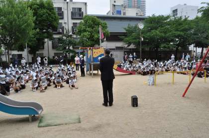 公園で、北区長様、連合町会長様の話を聞いて避難訓練の修了としました。その後、保護者へ引き取り訓練実施の緊急メールを送信して、引き取り訓練をしました。