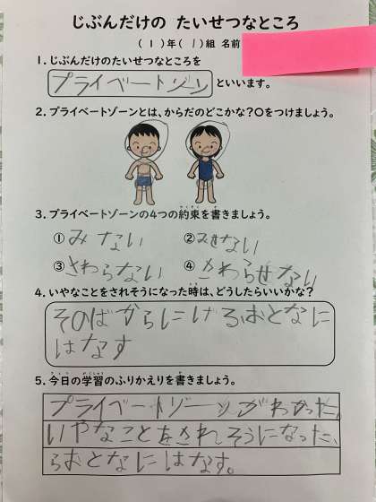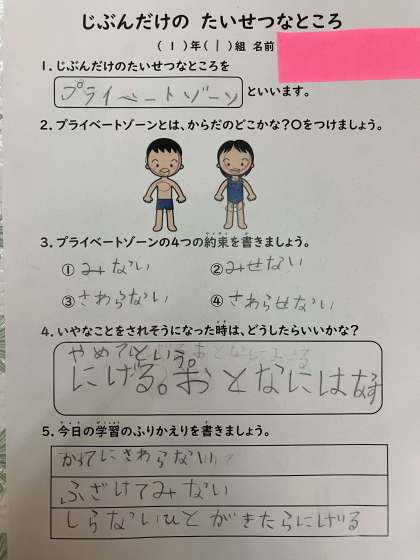 はじめに、プライベートゾーンが体のどこにあるのかを教わりました。次にプライベートゾーンは「〇見ない〇見せない〇触らない〇触らせない」という4つの約束を聞き、もし自分の体を見られたり触られたりするような場面に出くわしたらどうしたらよいか考えました。子どもたちの感想には、「プライベートを初めて知りました。」「(もし危険を感じたら)その場から逃げます。」「自分やお友だちのプライベートゾーンを守りたいです。」などと書かれていました。